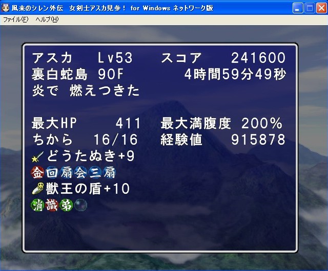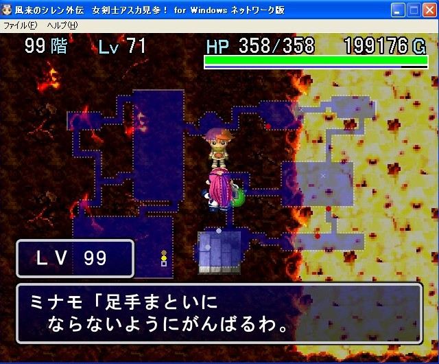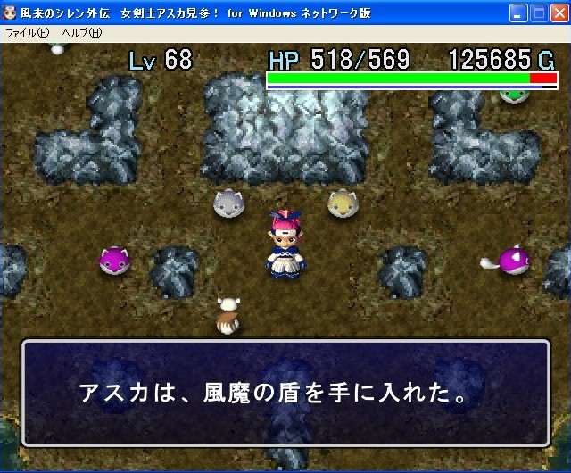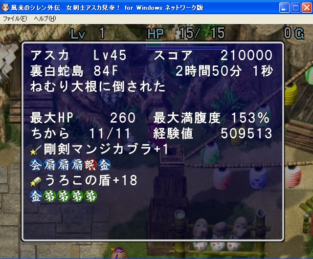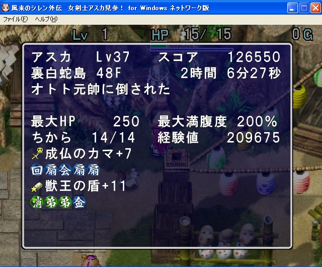 アスカ見参を寝起きにもそもそとプレイ。次はカカ・ルーの最深層を目指す事にする。転び石や粘りのプレイで序盤からがつがつLVを上げていく。んで途中の店でぶっとびハンマーとかいう武器があったので華麗に泥棒。こりゃ強いな。とか過信していたら通路で壁に背を向けずにイノシシと戦い保存の壷[5]と保存の壷[4]を失う。しかも中身が全部身代わりの腕輪…合計9回分のアスカの命。この凡ミスが非常に効いた('A`)それでもなんとか潜っていったがぶっとびを過信しすぎて呪いの罠があるにも関わらず無理をして(というか見極めを誤って)死亡。なんか凡ミスが非常に多かったorz というかカカ・ルーって結構楽になったような…。一度斎戒までクリアしたので体で慣れたんでしょうか。思っていたよりかは最深層は難しくないと思います。てか身代わりを失わなければいけたんじゃないかと('A`)