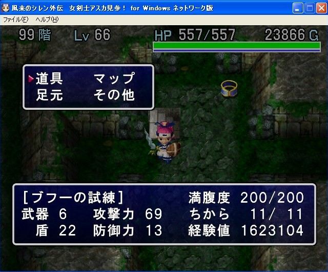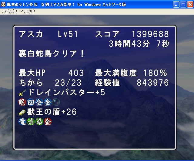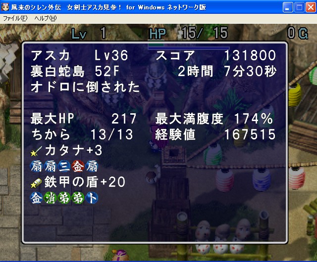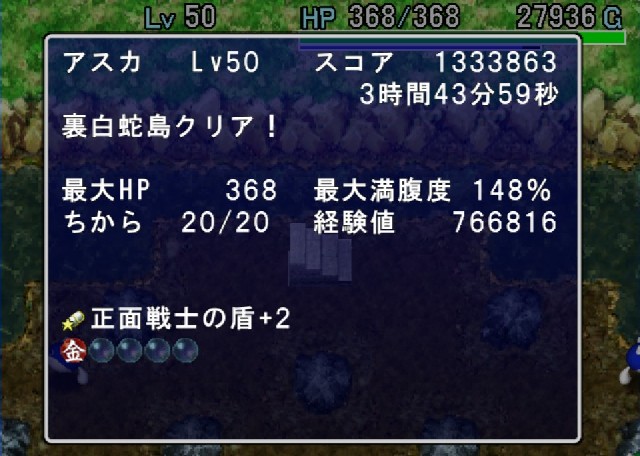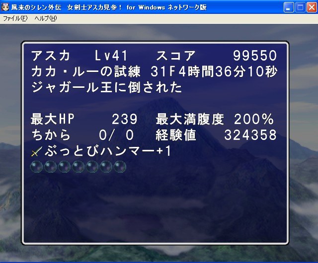 暇を見つけてはちびちびとアスカをプレイする。最近は救助が出来る様になったので救助をしまくって遊んでたんですが本格的に最深部到達をしなければと思い……ってか単に救助が飽きたというか他の事がしたくなっただけです。そんな訳でカカ・ルーに潜ろうと思ったのですが、この前の凡ミスの31F終わりの事を思い出して連続でカカ・ルー最深部に挑戦する気力が失せたので、魔道ことドラスの試練に挑む事に。カカ・ルーの時もそうでしたが一度斎戒まで行ったからある程度体が慣れてるのですかね凄くいいテンポで進んで行く。6F途中辺りでトドにしあわせの杖振ってアイアントドにして増殖させて倒しまくる事を思いつく余裕もあった。(たまたまトド倒してみたらしあわせ落としくれたのが良かったですこれが非常に良かったかもしれない。浅い方でアイテムを溜め込み、杖は身代わり・封印・かなしばり・鈍足・からぶりを主に貯めていく。巻物も転写が複数に様々な種類の物と実に良い感じだった。カンガルーフロアではねだやしがあったので良かったのですが、しおかんべんが出てくるところではかなりの苦戦を強いられました。いきなりの開幕モンスターハウスで身代わりの杖が減る減る・・・しかもHPも8とかかなり紙一重なところを行き来する始末(一応身代わりの腕輪はあったのですが)1回の大部屋モンスターハウスで身代わりの杖が10回弱減ったときはもうだめかと思いました(;´Д`A```あとはタイガーウホホーンに味方のNPCを投げられる→モンスターハウスに飛ばされる→NPC死亡の危機これも4回くらいありましたな(;´Д`A```まぁでも流石にLV99のNPCは強かったですね。攻撃の要となってくれました。まぁそんなこんなで盾がない分気分的にも私自身は余裕がなかったのですが、99Fに降りてみると身代わりの腕輪×5・復活の草×2とかなりの余裕があったみたいです。死なないように死なないようにを常に意識してHPが1桁2桁を彷徨う事が多かったのでもっとアイテムに余裕がないと思ってたら意外とそうでもなかったみたいで…。NPCやモンスターの動き等ある程度7~8割がた予想できるので、この辺が功を奏したんでしょうかね。ステータスとかはこんな感じでした。それにしてもクロンと同じく99Fを目指して1発でクリア出来るとは嬉しいものですね。カカ・ルーは余裕が無いので次にやるときにはアイテムのツモに恵まれると良いんだが…。とりあえず準備さえ整えば一番楽勝そうなブフーの試練を片付けるとしますか。