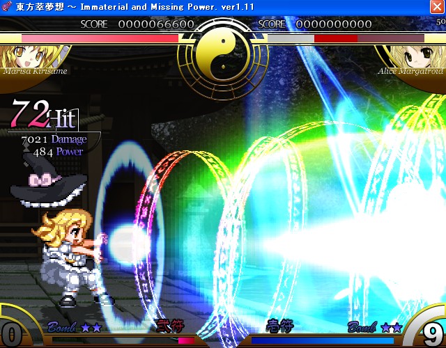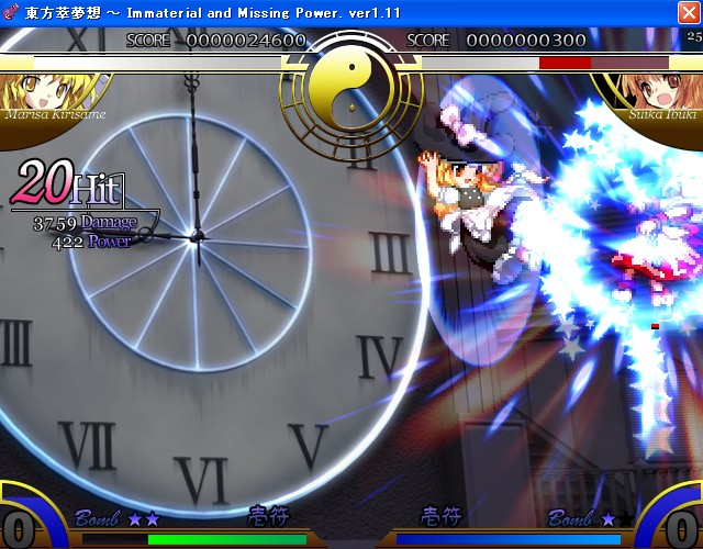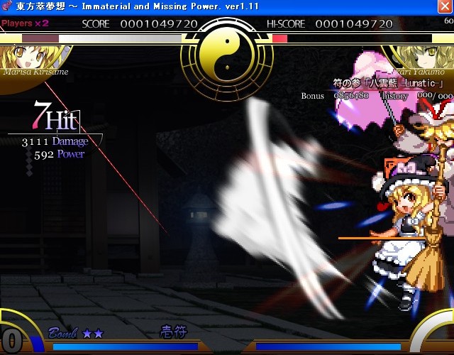 またまた東方萃夢想について。上手い人のリプレイを拾って見るの繰り返しをしています。総じて感じ取ったことは回避やガード等が非常に大切であるという事。俺はまずコンボから覚えていったのですが、その前に各キャラの技の射程や効果その範囲などを把握した方が良かったかもしれません。防御面が完璧、ないしそれに近ければそこからカウンターに繋げやすい印象を受けました。ちなみに今の俺と非常に上手い人のリプレイを元に作った擬似AIの対戦はこんな感じです。攻める→余裕でガードされるorギリギリで回避されるor撃ち落される→ぼっこぼこ('A`)酷い時は相手の射撃等の牽制で固められて動けないほど。まだまだ覚えないといけない事が山積みの様です。とりあえずはガードの練習でしょうか。今の俺は意味の無い場面でダメージ喰らう事が非常に多いです。しかし上手い人のリプレイは本当に参考になりますねぇ。動きの1つ1つに感心するくらいです。ただ「絶対真似できねーなこりゃ」と思う事が多々ありますが('A`)画像は上手い人のルナ魔理沙ストーリーモードの物。俺からすればこの人の動き全てがニュータイプです。