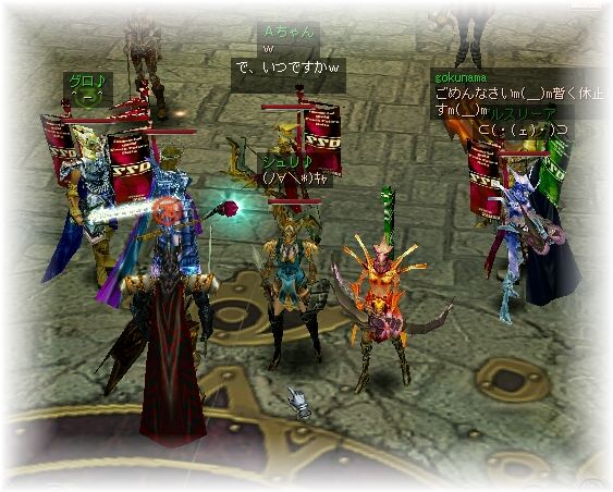 こんにちは!じゅじです。自分は、ほぼ毎日と言っていいほどコエリスのギルドを覗きます。時間にしたら数分もいるかいないかですが~・・・もちろんメンバーがいたら、挨拶をしてギルチャで話すことが多く、その間に自分を見かけた知り合いから内緒が入る事もあるし、話が白熱して20~30分話すこともある。狩りには・・・コエ鯖キャラでは、ここのところめったにいくことはない。だから当然のこと、フリポは切れている。昨日、久々にアリエンタへ狩りに行く事になり、支援にフリポを10日分だけ入れた。久々に組んだPTは野良だったのですが、とても楽しかった。その後、ラピスで少し遊んでから寝る前にコエリスのギルドへ・・・≪ラピ2 テラ緑化計画≫誰か居たら挨拶だけして落ちるつもりだった。。。が、珍しくギルメンがいる・・・しかも全員100↑(攻パラ・ヲリ2名)火炎にマゾ狩りに行こうと誘われ、支援で参加。100歳になりたてのヲリさんが火炎デビューで奥の登録が出来ていないので、自分と2人で輪廻から入り、門番のブタを倒し入り口へ。火炎奥の登録の2人のメンバーが入り口まで来てくれ、なんとか無事に奥の登録を完了することができました。その後はマゾ狩り・・・デビュー戦はなかなか痛かったかなw週末、こんなに長い時間クロノスにいたのは久々の事だったので、すごく楽しかった。その楽しい思いとは逆に・・・同じ日に内緒が数件はいった。その内の2件の内緒で知り合いが引退した事を知った。どんどん知ってる仲間がいなくなる。一緒に遊んで、同じようにキャラを成長させてきた仲間がいなくなる。さびしいな・・・と思いつつ、もうひとつのギルドに挨拶にはいるためキャラチェンジ。・・・チャット窓にでたコメント 『ギルドは解散しました』 ヽ(´Д`;)ノアゥア...