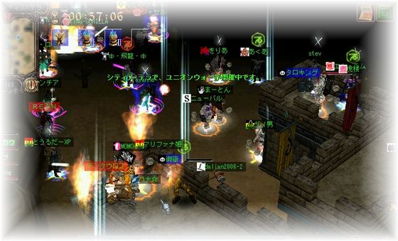 こんにちは~(´∀`)御嶽です。昨日のUW、宣戦布告して来たのは2週間前に対戦したしたギルド「†挑みし者†」。再度挑戦してきました(゜∀゜)アヒャ UWが開催されてから守備側の応援にきてくれたヲリさんもいたのですが、開催されてしまうと守備側ギルドの加入が出来なくなるのかな・・・せっかく来てくださったのに、入る事ができずにすみませんでした。でもとてもうれしかったです・・・ありがとうございました。昨日のUWは、この前のときより全体的に若干参加者が増えたような気がしました。門のところからSSを撮ろうとしてたんですが・・・なにぶん虚弱体質ヲリだもんですから(´Д`;)アウアウゾンビのごとく~、殺やれては甦り、殺やれては甦りを繰り返しながら参戦。そしてアークストーンに来た敵は焼く!!(自分は見てるだけですが。。。(;´Д`A ``` )攻撃側はもちろん袋叩き!!!・・・(自分はすでに逝ってますが。。。(;´Д`A ``` )そんなこんなで 今回も肉防衛いたしました。みなさん、お疲れさまでした!!!