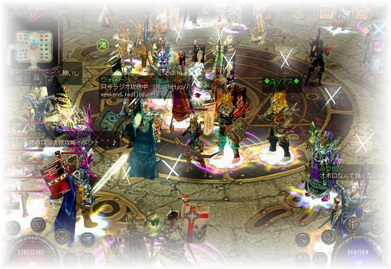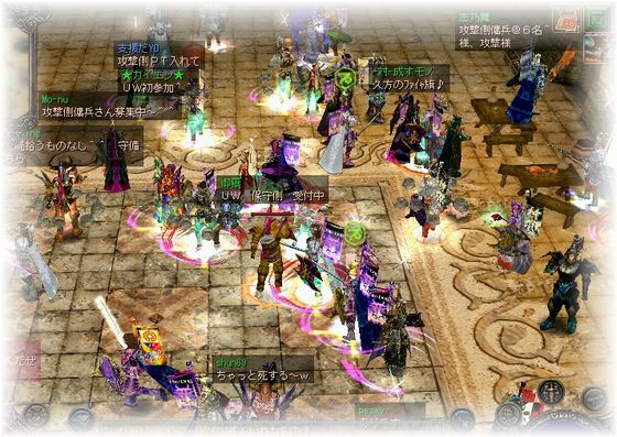 こんにちは~(´∀`)御嶽です。昨日コエリスワールドで行われた、UW『豚VS犬・アニマル対決』(勝手に命名w)結果は「犬」の勝利で終わりました。だって~犬さんったら、うるとらまん呼ぶんだもん(´・ω・`)・・・・・・と、いうことで、順を追って画像UPしていきたいと思います。なにぶん、攻撃されまくりで思うようなSS画像を撮ることすらできませんでしたので、それが残念といえば残念ですが・・・たった15分で終わったとはいえ、久々にUWだ~!って感じました(゜∀゜)アヒャ 久々にこんなに人いたの?っていうくらい集まりました。(これは傭兵の募集風景です。。。紫の旗が攻撃側)城門の様子です・・・このあと城門はあっけなく壊され、攻撃側が雪崩のごとく押し寄せて来ました。アークストーンを破壊しているときの様子です。。。。。この中に「うるとらまん」がいるのがおわかりになるでしょうか?うるとらまん・・・ズームUPわずか15分足らずでアークストーンはもろくも崩れ去り・・・攻撃側は勝利に酔いしれております・・・・・って攻撃側ってこんなにいたのね(´Д`;)次は攻撃側で参加するぜ~!・・・ただし今度は肉じゃなくてマジで行こうかな♪(´∀`)それにしても「うるとらまん」強すぎ・・・(ボソ・・・以上、UWの結果報告でした。