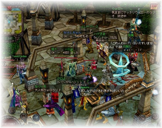 こんにちは!じゅじです。昨日はラピスバルの所属している「自由の鐘コミュニティー」主催の「オボロ図書館攻略イベント」に参加してきました。例のごとくロビーの状態・・・・・自分が立っている位置はロビーの上半分のところですので、あと半分にも人がおります。参加人数は正確にはカウントしてはいないのですが、8Fの時点でPTマークを数えたところ・・・フルPTを示す赤いマークが11個、黄色が1個だったので約70名前後ではないかと思います。13Fでの突撃の様子・・・ワープポイントから次々と人が出ていきます。まるで沸いて出てるといったかんじです・・・・・フロアに入ったころには1回目の殲滅が終わっているといった状態です。例のごとく、15Fあたりからオボロ被害続出・・・それでも、ラジオ中継あり、ノマチャでのコミュニケーションあり、新しい出会いがありとなかなか良いイベントだったのではないでしょうか。途中で落ちてしまって悔しい思いをした人も多数いたと思いますが、また次回もみんなでわいわい楽しむことができたらいいですね。最後に、主催・進行をしてくださったグロ♪さん、突然のリクエストに答えてラジオ実況をしてくださったウォローさん、お疲れ様でした。そして、参加された多数のみなさん、たのしい時間をありがとうございました&お疲れ様でした。(*´Д`).。oO(ずっと壁の華でしたがLV80になりました・・・)