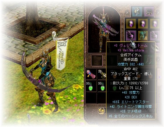 こんにちは!じゅじです。まずはお知らせから・・・本日午後10時より、ラピス2鯖にて図書館攻略イベントが行われます!くわしくはこちら! 勝手にリンクしてごめんねwさて、ラピスバルの「シュリ♪」ですが、先日ゲットしたルゥを売りまして「ヴェリカストーム+3」を格安の10Gで購入することができました!!!出来れば+5↑にしたいのですが、一緒にマタリン+6のセットも購入・・・手持ち財産がすっかりなくなっちゃったので、あとはぼちぼちと合円を探すことにしました。LV80まであと50%弱、できたら今日中にでも80まで上げてしまいたいなぁ~・・・(´∀`*)ウフフ