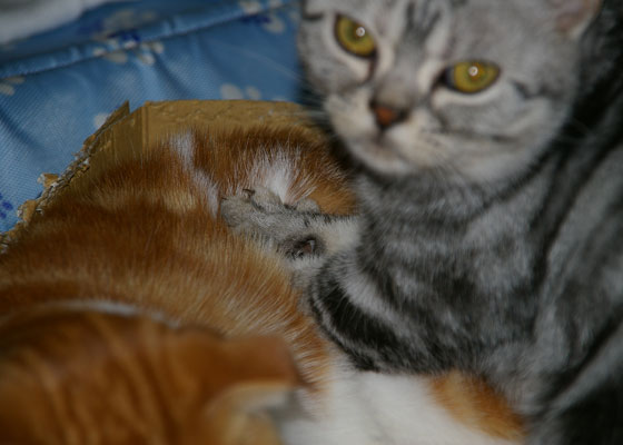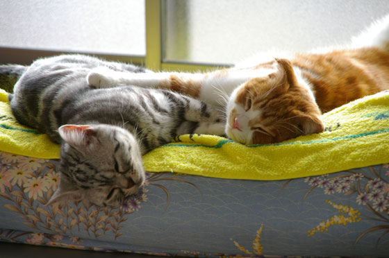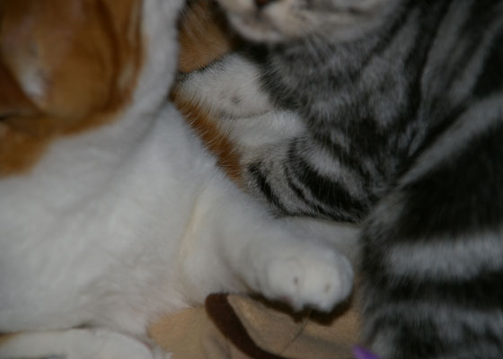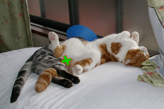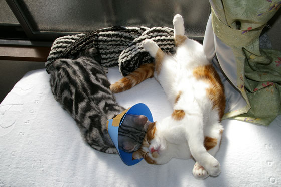 珠美が珠里のしっぽを挟んで昼寝中! 手術後の、バンソコがもうすぐ外れそうです。