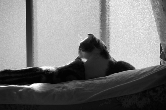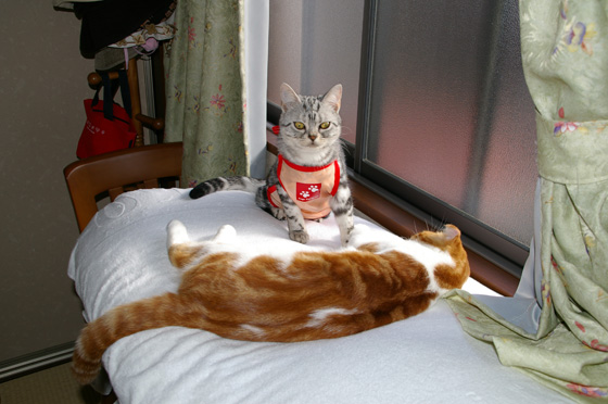 今日はパパさんの窓掃除を手伝ってくれました!窓の外からタオルで右左に窓を拭くと同じように、二人が室内で右左にジャンプを繰り返してくれました!可愛いですね!残念ながら写真には撮れませんでしたので、次はなんとか撮影の工夫を考えます。毎週窓掃除になりそうです。でっ! 掃除も終わりいつものように窓際でお昼ね。しかし、珠美が危ないと思っていましたが、やはり・・・そのまま滑ってドスン!珠美も「ドンくさい」ところがあり ホッ!っとした年末大掃除の一日、珠美のお腹の抜糸も今日無事終わりました。落ちるくらいに元気です!みなさんのご声援ありがとうございました。