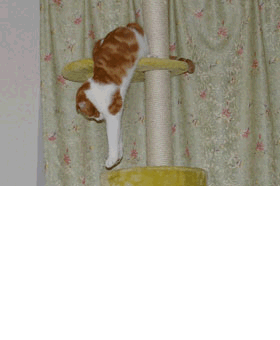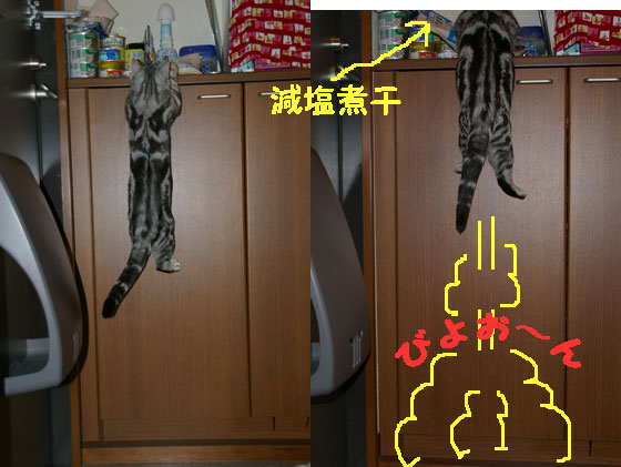 なかなか、降りようとせず(本人は降りたくてしかたがないようです。)手を出したり引いたりするイメージをハデにしてみました。完全に腰が残ってます。シッポも・・・で・・・やっと一段降りることができ”ホッ”としています。このアニメを作るのに時間がかかってしまいまして遅くなり申し訳ありません!