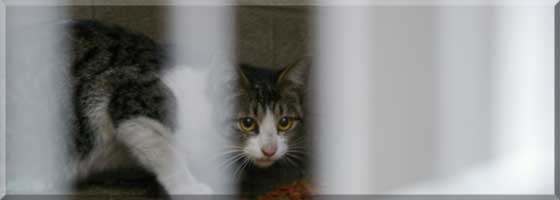 ニャンパパもニャンママも、家でお風呂に入らないんです。エッ?不潔?いえいえ違いますよ。二人ともフィットネスクラブのお風呂に入ってるんです。ニャンママは仕事帰りの夕方。ニャンパパは朝は7時にチェックインして朝風呂。そして仕事帰りにもう一度。まめでしょ~で、3日前の夕方の風呂帰りに、ニャンパパが「フィットネスクラブと隣の牛丼店の間に6ヶ月位の猫が居る」って・・・・がりがりに痩せてよく見ると尻尾の先が毛がないって。側には来ないから判らないらしいんだけど・・・ニャンパパはコンビニに飛び込みシシャモ3匹買ってポンと投げてあげたら、警戒しながらもあっという間に。慌てててコンビニに戻りもう6匹。野良ちゃんの居る場所は室外機とかがあり、人が入らないように金網してるので安全なの。それ以来、朝はニャンパパがカリカリ、夕方はニャンママが缶詰をあげてるの。警戒心が強くご飯をおいていなくなるまでは出てきません。でも、そのほうが安全。大阪は意地悪な人が多いから・・・昨夕ニャンママが缶詰を紙皿に入れてると、様子を伺う野良ちゃんの姿が。「あっ!又何かくれるにょかにゃ?早く置いてあっちに行って欲しいにゃ」って顔して・・・ニャンママは初めて姿をみたの。警戒した顔だけど白にグレーのぶち虎の可愛い子。そして、尻尾・・・・絶句しました。先から10センチくらいが真っ黒な針金のように見えるの。側には寄れないからはっきり判らないんだけど骨しかないように細いの。いったい何があったのかしら?毛が無いだけなら、あんなに針金のように細いかしら?判らないけど、私達に出来る事はご飯を運ぶ位。本当は保護してちゃんとしてあげたらいいんだけどごめんね野良ちゃん。