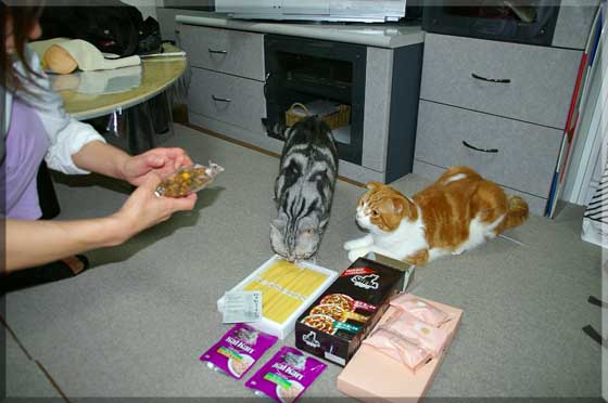 お友達ののれんsさんから、珠里の2歳の誕生日プレゼントいただきました。ありがと~~~~ございます!!!感激です!のれんSさんはご結婚前はニャンママの近くにお住まいでした。今は大家族のお嫁さんとして元気に明るく奮闘されてます。で、中はなにかな~?お~色々入ってるよ~右はマドンナ団子(三色のあっさりしたお団子)数が減ってるのは、ニャンパパ、ニャンママ待てなくて試食しちゃいました~美味しい!左が伊予柑そうめん食べた事ないので楽しみです~そしてカルカンに二人の大好きなシーバだよ~ほ~ら、わかる?珠里「おかあたんのお友達の、のれんたんがくれたにょか~うれしいにゃ~」珠美「わたちは、これが好きにゃにょよ。これこれ!おかあたん早くあけて!」ニャンママ「珠美~これはおにいちゃんに頂いたんやで~」珠里「いいよいいよ。おかあたん珠美にもあげて!」ニャンママ妄想劇場でした。のれんさん本当にありがとうございました。