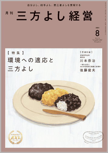 <巻頭言>“三方よし”から見た日米の経営 / 白鴎大学名誉教授 高橋浩夫<特集 環境への適応と三方よし>変化を恐れず未来へつなぐ ―― 挑み続ける老舗の多角化戦略 / タイヘイ株式会社代表取締役社長 太田健治郎千葉県匝瑳市に本社を構えるタイヘイ株式会社は、M&Aなどによって食品・印刷・金融の三業種を柱に約90社を抱える複合企業だ。八日市場(匝瑳市)で江戸時代初期から続く造り酒屋が、明治13(1880)年に味噌・醤油の醸造業へと転じたのを創業とし、今年で145周年を迎える。経営環境に適応するため、多角化を進めた背景とその根底にある思想について七代目の太田健治郎社長に話を伺った。<特集 ポイントオブビュー> 環境変化に備えるファミリービジネス / セブン・スプリングス株式会社代表取締役 武井一喜<特集 『道経一体経営原論』をひもとく> <父を憶う> 当てにされる人になりなさい / 有限会社ありがとう代表取締役社長 竹本裕司<三方よしへの挑戦>あんづくりで紡ぐ「豊かさ」の輪 / 株式会社木下製餡代表取締役社長 木下大輔さいたま市で地元の和菓子を黒子として支えながら「五方よし」の経営を実践する企業がある。創業94年、戦後から地元大宮に根差し、あんこの製造販売を行う株式会社木下製餡だ。「あんこ」を再定義し、世界へ羽ばたこうとする同社の強みの源泉を探るべく、木下大輔社長に話を伺った。<人を大切にする五方良しの経営学 39>お客様と地域社会へぬくもりを発信する / 人を大切にする経営学会事務局長 坂本洋介<「永続」への転換戦略 41>地域を元気にするさまざまな人口 / 東京大学名誉教授 月尾嘉男<特別対談>公のために尽くすことそれが「小原鐵学」と「商人道」 / 城南信用金庫相談役 川本恭治 × 100年経営研究機構代表理事 後藤俊夫<格言に学ぶ職場のモラル>その動機は誠実か<飛耳長目>一般社団法人人を大切にする経営学会 編著 /『人を大切にする経営学用語事典』<三方広場>