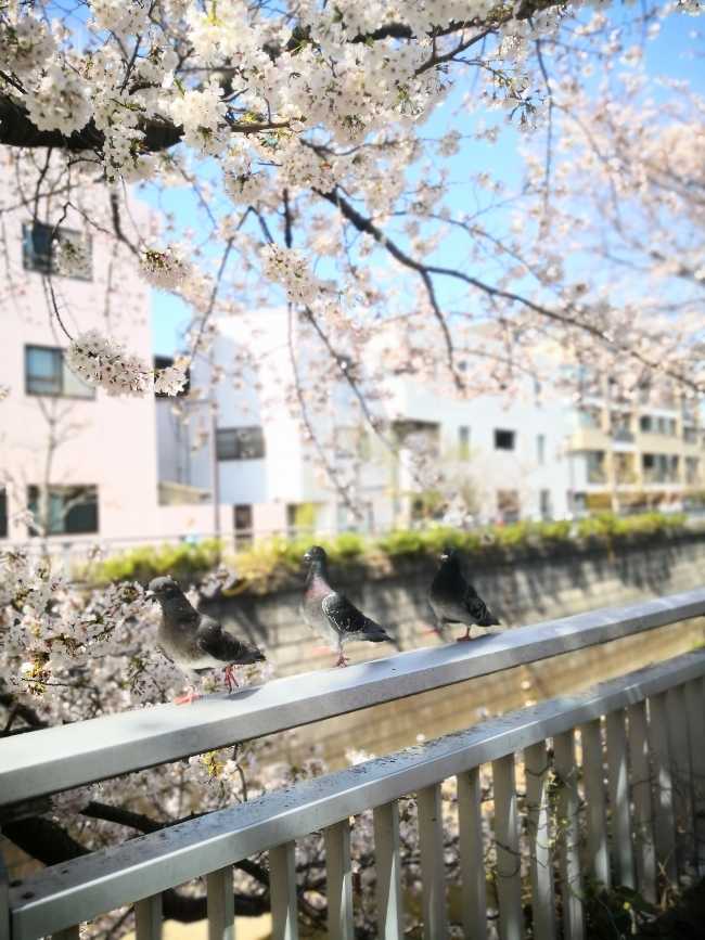 鳩3羽が並んで手すりの上を歩いてお花見🌸🌸🌸
