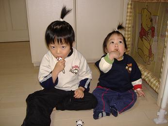 最近ふと思いつきました。「兄弟なんだから、おそろいの服を着せた~い!」思いついたらすぐに行動したい私は、早速今日お買い物。先日のバーゲンで自分の服を買ったお店で、今度は子供の服選び。だんなと長男にはベンチで座って待っていてもらって、次男を抱っこして服選び。どれにしょうかな~。せっかくだから、季節を問わず、長く着られるものを選びたい。長袖のTシャツかトレーナーかどっちにしよう?悩みに悩み、トレーナーを手にしてレジに向かう途中、50%オフ(それまでは30%オフ)の表示のコーナーが。ちょっと見ると、薄手の半袖のトレーナーがあり、絵がかわいい。半袖のトレーナーなら、今の季節寒い時に羽織ってもいいし、春先もTシャツの上に着てもいいし、大きいのを買っても袖が長くて手が隠れることもない!しかも、買おうとしていたトレーナー1着分強の値段で2着買える。さっきまでの迷いはなく、買ってきました。う~ん、嬉しい(*^_^*)次男の長い髪でちょんまげしたら長男もしてほしいと言い出し、男なのにちょんまげの2人。アホ面がまたおもしろいです。大きめサイズを買ってきたので、2年くらい愛用したいと思います☆