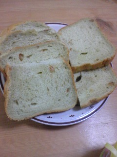 昨夜タイマーでセットした青汁くるみパン。 今朝は、キレイに焼けてました取り出すとき、ちょっとドキドキでした。見ると、キレイな緑色。ん~~、おいしそう冷まして切ると、青汁の粉をそのまま投入しましたが、キレイに混ざってました。ほんのり緑色っぽいの、わかります??味は、青汁の臭さは全くなく、くるみがおいしかったです。だんなにも子どもにも、好評。そのままだとおいしくない青汁も、パンに混ざれば、平気です夜には全部食べちゃいました。今度は、何パン焼こうかなあ??楽しみ 今日は、夕食後、次男とオムツを買いに行きました。1人で行こうと思ってたのに、どうしても一緒に行きたいって泣くの2パック買って来ましたが、1つは次男が運んでくれました。ずりずり引きずって・・・部屋の中まで、離すことはありませんでした。こすられて、絵が消えかかったパッケージ。次男のがんばった証です。ずりずり引きずる姿、とってもかわいかったです