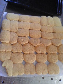 今日は、お義父さんの3回忌。お義兄さん一家は、胃腸風邪で来られず、家4人とお義母さんとで。私がお経を読んで、質素に行いました。お義母さんは午前中に来たので、午前中に法事を済ませ、お昼ご飯は、木曜の夜から寝かせてあるカレーでカレーライス。白菜、大根、ニンジン、豚肉で作ったんだけど、美味しかった食べ終わったのが12時半頃。お義母さんが帰るのは、4時過ぎ。まだまだ時間があり、暇を持て余していたので、だんながクッキーを作ることに。(暇だって言うから、「じゃあ何かおやつ作って!」と頼んだの)学校で習ってきたレシピを参考に生地を作り、型に入れ、ハートと長方形のクッキーができるはずだったんだけど、できたのはこちら。だんながぎゅうぎゅうに並べたため、一体化かわいいハート型は??あの型を使った意味は???でも、美味しかった~~お義母さんも、美味しい美味しいと、パクパク食べてました。まだ残ってるので、明日も食べようっと。