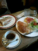 410円~ブレンド珈琲をフラスコで淹れて、トーストやクロワッサンとサラダ&卵等で朝食。