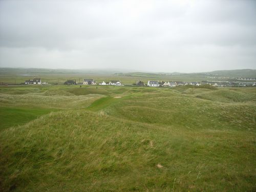 雨と風の中を進む寒さで目が覚めたまだ6時前、脳は覚醒していてもう一度眠れるはずもなかったはやる気持ちをおさえながら、朝食の時間まで部屋でストレッチをして過ごしたが、自分でもストレッチに身が入っていないことがわかる朝食を終え、さあ、出発だ。 18ホールどんなに雨が降っても、風が吹いても、望むところだ受付を済ませ、キャディマスターにキャディを依頼したあてがわれたのは16歳のショーンという少年だった握手をし、名前だけの自己紹介をすると「俺はこのラウンドで、ボギーが取れれば良いので、楽にボギーオンができるようにガイドしてほしい。 そしていくつかのパーが拾えて、結果80台で回れたら望外の喜びだ」と彼に伝えたゲームはオーストラリア・パース郊外に住むという熟年夫婦との3サムで始まった1番ホールは右に打ち出すと村の墓を直撃することになり、プレッシャーがかかる写真の右中ほどに見えるのが村の墓だ4Wで放ったティーショットは右に出たが、墓のはるか上を越えて、ゴルフの地に眠る英霊を不機嫌にさせることだけはなんとかまぬがれたしかし、どのショットを取っても、自分の体ではないように、ボールがまともに打てず、トリプルボギーでスタートした2番ホールも4Wでティーショットを打つと、今度は左に巻いてバンカーにつかまった幸いなことにポッドバンカーではなかったが、そこから多くの無駄なショットを費やし8を叩いた続く3番ホール211Yのパー3でようやくボギーが取れたが、ボギーを取れればよいどころではなく、ダボでも相当に努力しないと取れない思ったよりも、手強いぞ、、、絶え間なく吹き付け体を揺すぶる風、容赦なく叩きつける雨、フェアウエイのうねりに、ウエッジ以外は受け付けないきついラフ、キャディがいなければ、どこに向かって打つのかさえわからないホール叩く理由をさがせばいくらでもあるが、単に自分がヘタなのだと改めて思い知らされるキャディのショーンは無駄口はきかないが、彼が父親がプロゴルファーであったこと、父の手ほどきをうけながらゴルフを覚えて、現在ハンディ8の腕前であること、他のアイリッシュのゴルファーと同様、低いドローボールを持ち球とし、フェードもドローも必要な時に打ちわけることを覚えたというフロント9を終えて、リンクスをラウンドしている高揚感はあるものの、ボギー5つ、ダボ2、トリ1、+4が1で52と50も切れないやはりリンクスとは手も足も出ないところなのか、、、自分を信じたいが、違う種類のゲームをプレイしているように感じるバリーバニオンを見渡す丘で10番ホールの出来事だった、横風に負けたドライバーショットは2時の方向に飛び出して丘の向こうに消えたショーンが『ボールは浅いラフか、そこからほんの少しのところにあるよ』と言う『なぜそれがわかるんだい? ボールの向きかい?』と尋ねると、『それもあるけど、ボールが浅いラフに落ちた音を聞いたよ。 転がってもラフの入り口だ』『…』 言葉が出なかった自分には200Y先のフェアウエイと浅いラフにボールが落ちたときの、その音を聞き分けることなど到底できないだけでなく、見えないボールをそうやって追う、『ゴルファーの本能』を働かせていなかった事に気づかされたプロの父の手ほどきを受けたとはいえ、16歳の少年はゴルフというゲーム、キャディという職業を全うすべく全身全霊をかけてjunhiroのバッグを担いでいるのだなんだか、自分のニブさが惨めに思えた一方で、心の中に他の気持ちも湧いてきたリンクスは難しかったと諦めるのは簡単だが、なんのためにアジアの東の端から、ヨーロッパの西の端まで遥遥やってきたのか? と、、、打ちのめされる自分を見るためではなく、自分とゴルフの関係を見つめなおし、ゴルフの原点をこの目で見て、それを今後のゴルフに活かすためにこの地にやってきたのだそう、ここで自分が失うものは何もないし、このままラウンドを終えれば間違いなく後悔が残る自問自答する。 リンクスに怖気ずくのは簡単だが、そのコースでプレイをしようとする自分の中の恐怖と戦ったのか?いや、それはここまでできていないただし、Never Too Late、まだ18ホールを終えたわけじゃない自分の心を変えるのに遅すぎることは何もないなぜ最果ての地まで来てスコアなど気にしているのか?そんな小さなことのためにお前はここに来たのか?勇気を持ってドライバーショットを放ち、狙ったところにアイアンでボールを運び、パットが少しでも入ればそれ以上、何を望むというのか?14番の短いパー3、向かい風を切り裂いてボールが飛んでいくしかし風に負けてグリーンの遥か手前でボールが落ちたチクショウ! パーは逃したがイージーボギーだったそう、この気持ちがなければいけないのだ相手がリンクスだろうか、河川敷のコースだろうがゴルフと対峙するのはこの自分なのだ15番ホール 乗せるか、飲み込まれるか15番はピンまで220Y弱の打ち下ろしのパー3、向かい風に