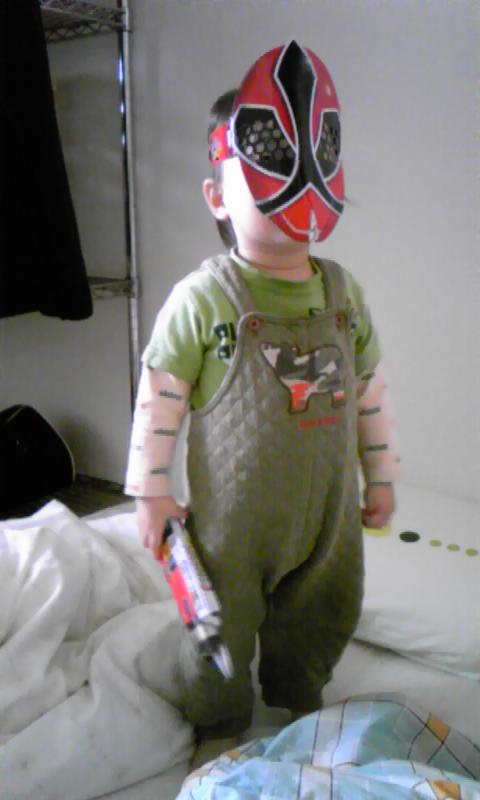 幼児雑誌の付録のお面&ショドウフォンでシンケンレッドになりきってます☆