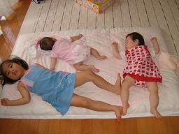 今日は3歳のまなちゃんと3ヶ月のそらみちゃんんちに遊びにでかけた。まなちゃんは幼稚園が夏休みに入ってとーっても暇してたみたいで、ムスメっちと私を大歓迎でむかえてくれた。ムスメっちもお姉ちゃんと遊べて大興奮。いつも以上にパワーアップして遊んだせいか、いつもの昼寝の時間に寝てくれず、15時になってようやくみんな揃って遅めのお昼寝タイム。でも、3歳ともなると昼寝も浅くなるのかまなちゃんはあっというまにご起床。。。そらみちゃんができてママに甘えられない分、寝ている間に抱っこをせがんであかちゃん返りしている間残された二人は爆睡。。。。そらみちゃん、寝返りして、うつ伏せ寝じゃないと寝れないようなんだけど、呼吸できてるか心配でみてるこっちのほうが気が気じゃないけど、これが大丈夫なんだな。おおーこわい。。こうやってみると、9ヶ月の成長の差が一目瞭然。ムスメっち、でっかく感じるね。