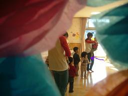 先週は保育園の「のぞき穴保育」がありました。これは、子供たちにばれないように親が子供の保育園生活をみることができる行事で年に3回ほどあるのです。どうやってばれないようにしているかというと、このように紙の花がガラスにはってあってその隙間からのぞくという一瞬「ばれるんじゃないか!?」と思うようなそのしかけ。これが絶対ばれないのです。ダンスの時間みたいで「おしりかじり虫」結構ノリノリで踊っております。で、まもなくお絵かきの時間で、家では椅子に座ってじっとしていることが絶対できないムスメっちも保育園お友達に触発されるのかじっと座ってやっています。頑張っていてくれるのをみるとこちらも子供からパワーをもらえ、頑張るパワーが沸いてくるモンです。