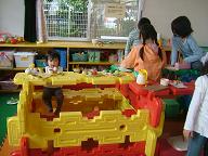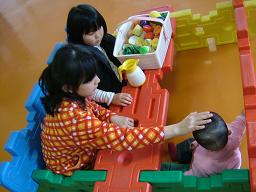 今日は風が寒い!黄砂もまってるようだし、とてもじゃないけど公園には行けないので、近所にある児童館に行ってきた。ここのよいところは、保育士さん手作りのおもちゃがたくさんあること!お手玉やおはじき、剣玉、メンコ、わらばんしに印刷してある塗り絵、ペットボトルや折り紙でできたおもちゃ、ボタンかけ練習、ひもとおし練習などなど既成のおもちゃにはない温かみがとっても和むのだ。中に入ると、小学生が巨大ブロック!?みたいなもので建物を作っていて、どうやらレストランらしい。ムスメっちもお客として入店。足湯付のレストランということらしいけど、足湯なんて発想が今時の小学生らしいね。ムスメっちのことをいつも可愛がってくれる小4のおねえちゃん。今日もかいがいしくお世話を焼いてくれ、チビたちにお絵かきも指導。本当に気の利く子で、帰るときささっと靴箱に行き私とムスメっちの靴を出し、そのうえムスメっちには靴をはかせてくれた。ありがとねームスメっちもあなたのように素朴で優しい子になってもらいたいものだわ。