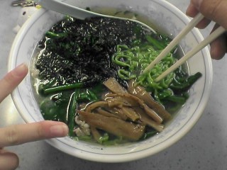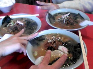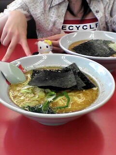 いや~、今日はまた全国的に大雪だったようですな。ニュースを見ててビックリ\(◎o◎)/!九州で10センチ以上積もってたりするんすねぇ。しかも鹿児島だってさ。鹿児島なんて、オイラからしたらもう南国ですよ。その南国鹿児島で大雪だってさ。中継見てても、ここ北海道じゃないの?!ってくらいすごかったね。鹿児島の人なんて、雪なんて慣れてないだろうし。車なんてスリップしまくり。雪をナメちゃいけませんよ!って感じでした。さて、今日の日記はいつものようにラーメンネタなのだが・・・。普段は『おいしいものネタ』ということで紹介するわけだが。今日はちょっと微妙だったのね(^_^;)まぁいいや。今日はのりラーメンを頂いてきたのね。↓一面のりだらけですヽ(^o^)丿ここは仙台にしかないチェーン店で。店の謳い文句としては、『仙台豚骨ラーメン』なのね。市内に何店舗かあるこのお店。各店で味がそれぞれ微妙に違うのが特徴。豚骨ベースは変わらないのだが。なにやら、通常の5倍の豚骨を用いた超コクが自慢。うん、今日もコクは確かにあったのだが・・・。どうにもスープがぬるくて・・・_| ̄|○せっかくのおいしいスープが台無しだったのね_| ̄|○キティちゃんにとってはちょうど良い温度だったみたいですが(^_^;)そりゃキティちゃんはネコちゃんですから。当然ネコ舌なのね(^^)のりをおいしそうに食べていましたヽ(^o^)丿さて、明日はいよいよ『東北吹奏楽の日 演奏会』の本番っすよ♪キティちゃんと、ブン@percちゃんと、ノブちゃんとの共演ですヽ(^o^)丿みんなでいっぱい頑張って、楽しい演奏にしてきたいと思います。で、みんなは演奏が終わったら、忘年会だってさ。オイラとキティちゃんは二人でクリスマスするんだヽ(^o^)丿もう今から楽しみで楽しみでしょうがないわヽ(^o^)丿楽しいクリスマスヽ(^o^)丿明日からの3日間、いっぱい楽しもうと思いますヽ(^o^)丿