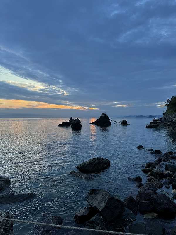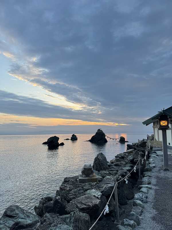 夫婦岩界隈や宿泊したホテルには、夫婦岩からの日の出についての説明や写真が多く見かけて、サブリミナル効果? 朝4時起床し、夫婦岩へ