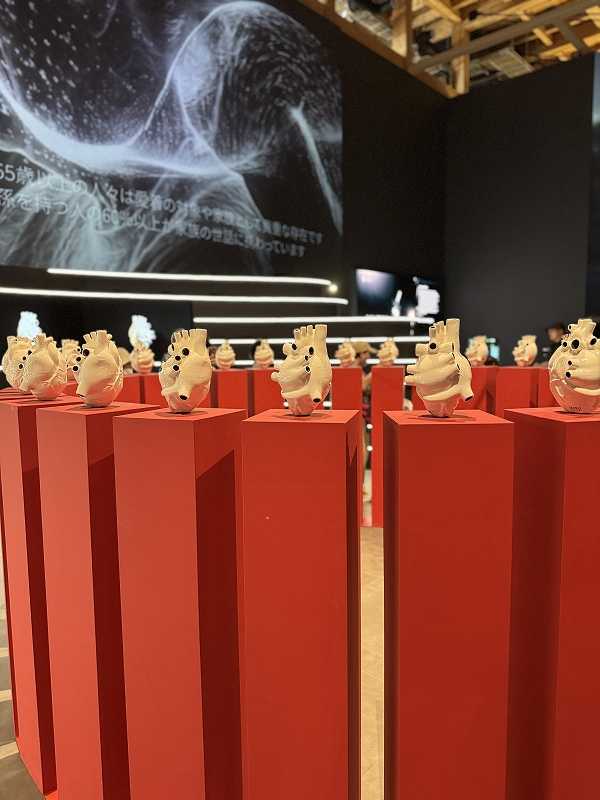 生命の継続的で無限のリズムを象徴するために円形に配置された 30 個の白い液体セラミックのハートで構成されています