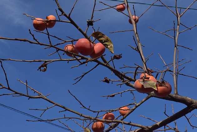 外出しようと車の所へ行くと 青空に熟した柿が映える