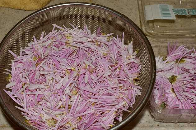 菊は茹でてお浸しに お湯には少しの酢を入れるのはお約束