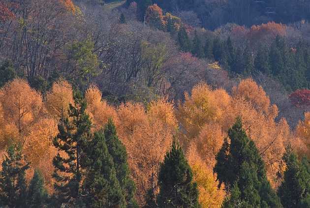 山10℃以下の気温 完全に落葉して唐松だけが紅葉している