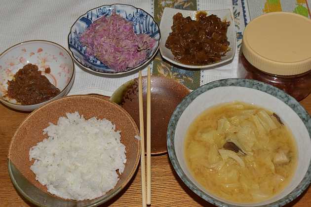 今夜の夜ご飯は お野菜中心 菊のお浸し キノコ味噌 味噌汁は季節の野菜