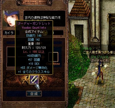 午後から野良エンタに入りました。そしてついにLv99に・・・・・1パーツも葡萄ありません><なのでそろそろ勇気を出して合成することに・・・丁度少し安めにKクラ売ってたので速攻買wさてさて、どこから作ろうかな?頭か胴か・・・・Kクラは一個。チャンスは一度だけ・・・材料を持ち、カイラの元へ・・・そして出来たものは・・・一発成功wわーい、初めての葡萄だでもまだ後4パーツもあるんだよね・・・とにかく全く葡萄無しから離脱できたのでよかったです。やっぱりカイラには少々強気オークでお願いするのが縁起いいのかもw葡萄が出来て機嫌がよくなったので、超久しぶりに支援君を強制INさせて狩りにLv1だけ上がりました(Lv差ありすぎてマゾい)支援君は途中こっそり追尾にしてインチキしてました<コラ!でも仲良く狩が出来てよかったです。