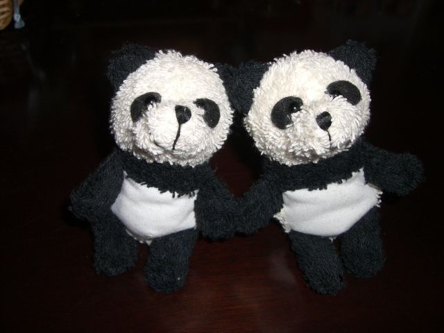 昨日、うちの事務員Aちゃんから突然プレゼントをもらった会って数分後にカバンからガサゴソとプレゼントの黄色の可愛い袋を取り出しわたしに差し出してくれた。「先ほどショウィンドウーで沢山これがこちらを向いて飾られていたからあまりに可愛くて」と黄色のく可愛いラッピングを紐解くと中からこんなに可愛い2匹のパンダ君が出てきましたAちゃんの優しい心に感激。で、我が家のリビングに2匹仲良く住みだしました。そしてAちゃん別れ昨日帰宅したら王子動物園のパンダが今回は妊娠か!!とのニュースで、過去にパンダ君が想像妊娠をした事があるから今回は静かに見守ろうとコメントパンダ君も想像妊娠をする事をしりビックリでした。何を隠そう♪わたしも数ヶ月前にパンダ君と同様の経験♪「あっ、妊娠したかも」「最近胸が大きくなったし、何だかむかついたり、珍しく食欲旺盛だし!!」と旦那さんに報告旦那さんは嬉しくて目をキラキラががががががが。数日経過し違うと判明(恥)何だか今日はパンダ君と縁もあり、Aちゃんとの愛も受け取り楽しい体験(後日記載します)もし幸せ一杯の日でした。