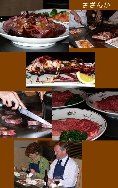 伊勢エビとステーキのコース。まだ生きている伊勢エビを半身に割った