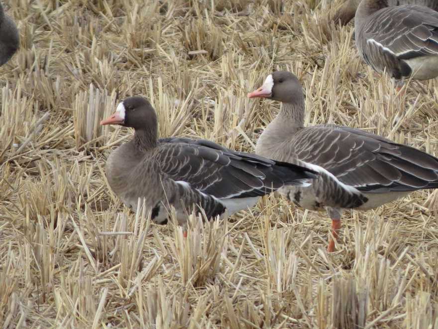 鳥友から伊豆沼、蕪栗沼にでかるにあたって、ハクチョウやハクガンであれば成鳥、幼鳥の区別はつきやすいのですが、マガンの場合はどんなところに着目すると齢が識別できるかと質問をもらいました。(成鳥、若鳥、幼鳥を比較すると)(1)成鳥は上面が灰褐色で尾羽に近づくにつれて黒味が増します。腹には不規則な黒い横斑があり、嘴は褐色味のあるピンク色です。嘴基部はの羽毛は白く額にかっています。(2)若鳥は、嘴基部に接する白色が小さく、腹に横斑がではじめています。(3)幼鳥は、若鳥に似ていますが、嘴基部に白色部はありません。(その他確認したいポイント)a.嘴の色成鳥はピンク色ですが、幼鳥はオレンジ色です。ただし、天気や日光の条件で変化することがあり、注意が必要です。b.嘴爪の色成鳥の嘴の先端部分(嘴爪)は白色、幼鳥は黒色です。(写真)一枚目から三枚目は成鳥です。三枚目の写真で嘴の先端部分(嘴爪)が白色になっているのがわかります。2024年11月27日伊豆沼、2019年12月1日手賀沼、2008年1月3日宮城県栗原市四枚目は2019年12月1日手賀沼で撮影した成鳥です。嘴がピンク色で嘴基部と周辺がピンク色の皮膚が露出したように見えました。五枚目は、2019年12月1日に手賀沼で撮影した幼鳥です。嘴基部の白色が小さいです。六枚目は、2023年12月8日に印西市で撮影した幼鳥です、嘴基部に白色があり、その周辺から額にかけて黒くなっていました。七枚目は、2016年12月23日宮城県栗原市で撮影した幼鳥です。嘴の先端部分(嘴爪)が黒く見えます。