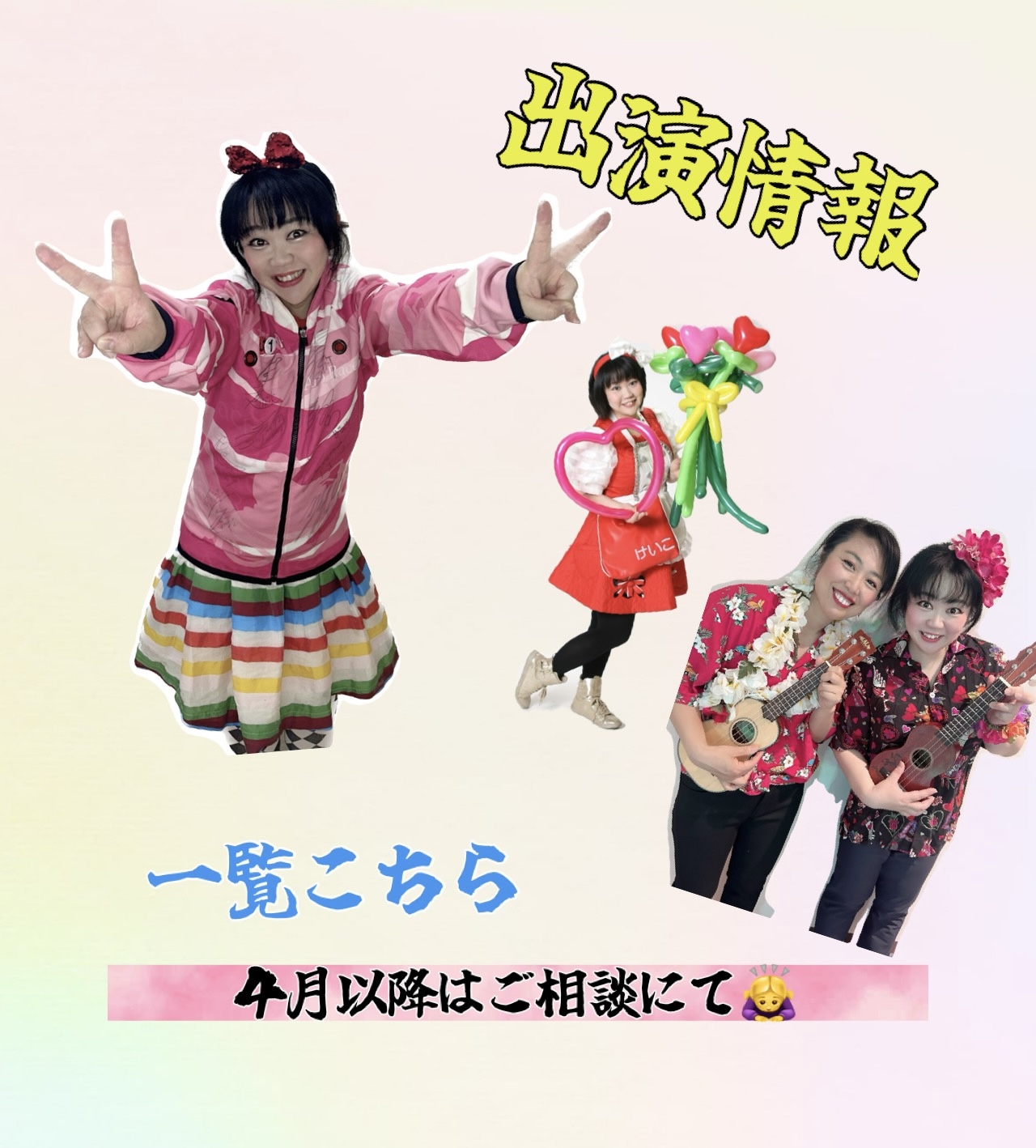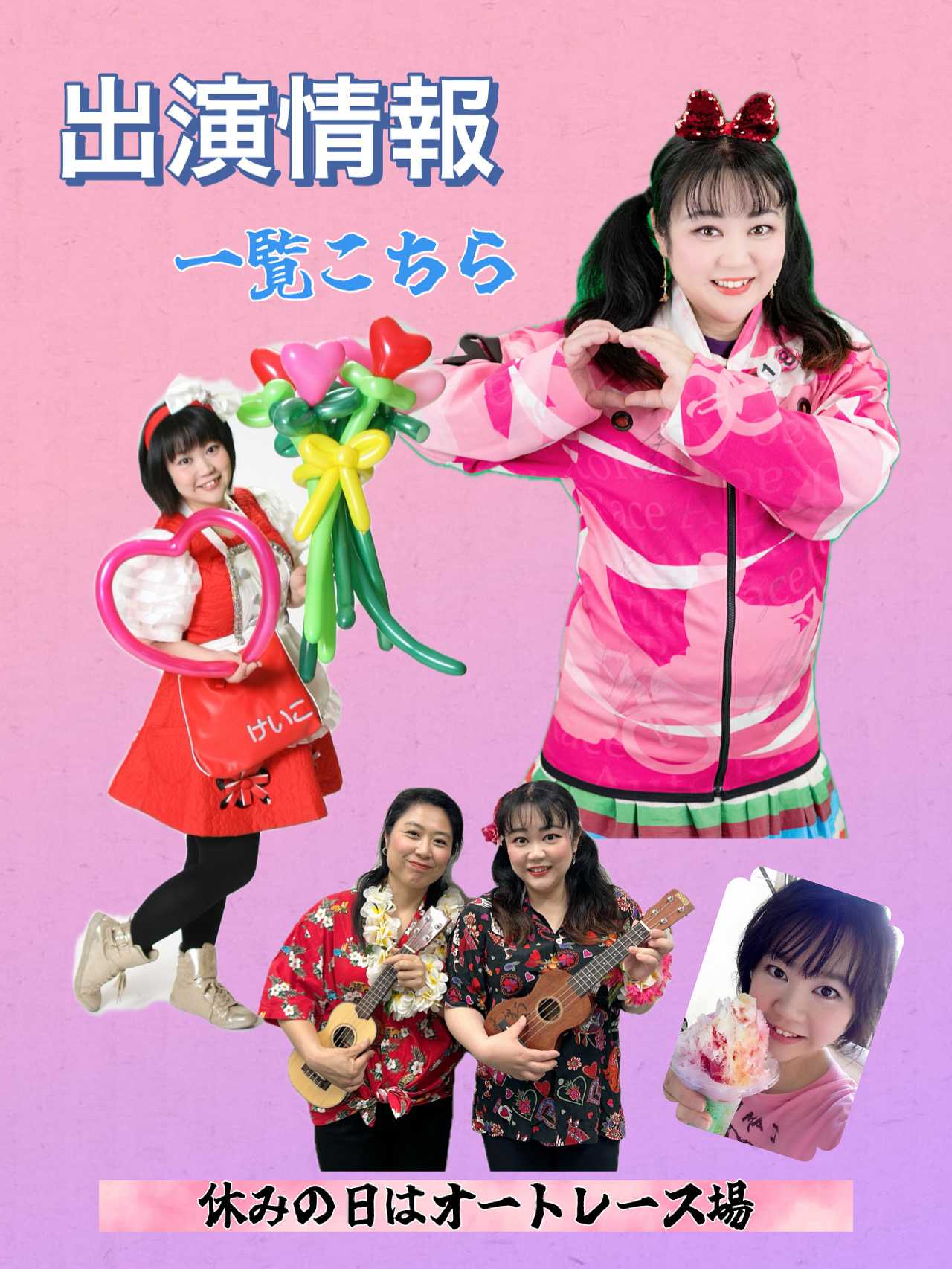 ☆こちらの投稿スケジュール更新致します☆OK日はお仕事決定優先でお受け出来ます!🙏10月末〜11月諸事情でカルーア啓子出演のお仕事に限り内容、お時間をご相談させて頂いております。個別に対応させて頂きますので、ご相談はお気軽にご連絡ください♪ 尚、弊社ブッキング等の業務には影響ございません。10/18(土)テルル湘南とうきゅう店カルーア啓子のバルーンアートプレゼント時間未定10/19(日)第3回ウルル寄席@戸越銀座「あかだ」Open 17:00 / Start 18:00 / 3,500円(1ドリンク付)ウルルJUN × カルーア啓子(バルーン漫談)品川区平塚2-18-6 ロダンビル2F最寄は戸越銀座駅🧡チケットは好評につき売り切れです。10/20(月)OK FMやまと公開収録予定10/21(火)OK 10/22(水)OK10/23(木)夕方までOK (17:00〜一門ミーティング)10/24(金) 企業様イベント(寒川)社員様限定のクローズイベントカルーア啓子のお笑いバルーンショーロッキー石井ものまねショー10/25(土)春日部ヤマダ本店カルーア啓子のバルーンアートプレゼント時間未定10/26(日) アンサンブル大宮日進文化祭(福祉施設) 🩷どなた様でもご参加&ご観覧出来ます!イベントの時間帯(予定)11:30~15:00カルーア啓子のお笑いバルーンショーとバルーンアートグリーティング10/27(月)OK10/28(火)OK 10/29(水)午前〜昼 幼稚園出演(神奈川県)【夕方以降OK】10/30(木)応相談10/31(金)応相談11/1(土)深見児童クラブ様(午前)予約制午後応相談11/2(日)応相談11/3(月・祝)静岡県御殿場市 イベント出演11/4(火)応相談 11/5(水)応相談11/6(木)西葛西演芸会18:00〜出演(予約制)💙どなた様でもご観覧出来ます!11/7(金)応相談11/8(土)社会福祉法人 桔梗苑福祉会地域密着型特別養護老人ホーム寿松園周年祭 出演カルーア啓子のバルーンショー静岡県湖西市岡崎602-1TEL:053-488-5311💙どなた様でもご観覧出来ます!11/9(日)au新越谷ヴァリエ店カルーア啓子のバルーンアートプレゼント時間未定11/10(月)応相談11/11(火)応相談11/12(水)応相談11/13(木)応相談11/14(金)応相談11/15(土)JA横浜大正支店農業まつり🩷どなた様でもご参加&ご観覧出来ます!カルーア啓子のお笑いバルーンショー1回目10:00〜/2回目11:30〜【夜】ミッドナイトオートレース配信出演予定11/16(日)SAMUKAWAお笑い祭り2025 🩷どなた様でもご参加&ご観覧出来ます!☆観覧無料☆先着500名〜出演〜冷蔵庫マン(お笑い)ふじきイェイ!イェイ! (ものまねショー)脳みそ夫 (お笑い)三遊亭あら馬 (落語)カルーア啓子(お笑いバルーンショー)開場 13:00/開会 13:20お笑いライブ13:30~14:50休憩 14:50~15:00抽選会 15:00~15:3011/17(月)ラジオ公開収録15:00〜16:00ゲスト 柳家あお馬さん11/18(火)応相談11/19(水)応相談11/20(木)応相談11/21(金)浅草東洋館出演※オートレース漫談カルーア啓子13:00〜11/22(土)㊙️サプライズなライブを予定してますので、今から空けておいて😊✨11/23(日)かすかべ湯元温泉アテンド【出演】虹の黄昏1回目:14:00~14:152回目:15:00~15:153回目:16:00~16:15かすかべ湯元温泉場所:館内1階エレベーターホール前ご入館のお客様は観覧無料。11/24(月)応相談11/25(火) 浅草東洋館出演※オートレース漫談カルーア啓子13:00〜11/26(水) 浅草東洋館出演※オートレース漫談カルーア啓子13:00〜11/27(木)応相談11/28(金)応相談11/29(土)飯塚オート11/30(日)飯塚オート12/1(月)応相談12/2(火)応相談12/3(水)応相談12/4(木)応相談12/5(金)応相談12/6(土)応相談12/7(日)親子ふれあいコンサート定員400名 事前申込観覧可能以降お問い合わせください。☆12/17 (水)飯塚ミッドナイト配信出演☆12/27 (水)飯塚ミッドナイト配信出演☆ 12/30 (水)かすかべ湯元温泉カルーア啓子のお笑いバルーンショー🩷どなた様でもご参加&ご観覧出来ます!ご入館のお客様は観覧無料。☆浅草東洋館☆#オートレース漫談 カルーア啓子出演時間ボーイズバラエティー協会下席出演予定11/21(金)13:00〜、11/25(火)13:00〜11/26(水)13:00〜https://www.asakusatoyokan.com/sp/timetable/new.php?detail_data=1445573780-103812【料金】大人:3,000 円 学生:2,500 円 小人:1,500 円開場12時00分、開演12時30分【番組告知】#飯塚オートレース場公式YouTubeチャンネル「真夜中の飯塚決戦~冬の陣~ザ・ドリームマッチ」出演中。FMやまと(FM77.7Mhz)カルーア啓子の『お笑い!ヤマトナデシコ』毎週月曜日19:30~20:00(再放送は毎週日曜日の16:00〜16:30)インターネットでも『カルーア啓子のお笑い!ヤマトナデシコ』が聞けます!FMやまとのホームページよりアクセスしてください。http://fmyamato.co.jpこちらからダイレクトアクセス🔻https://www.jcbasimul.com/radio/730★お仕事大募集★バルーンアート各種装飾、バルーンギフト、お笑いバルーンショーなどの他にも芸人、各種パフォーマー、鶏🐓、歌手、司会者、著名人などのブッキングなども行なっております。ご希望に合わせてお客様の心に沿った内容でお届けいたします。面白かった!頼んで良かった!と言っていただける内容に自信があります!!急な開催にも対応します!歓送迎会、各種イベントに!!是非、お気軽にご相談ください。カルーア啓子[お笑いバルーンショー/司会/オートレース漫談/歌謡漫才 東京カルーア/コント/かき氷/盛り上げ