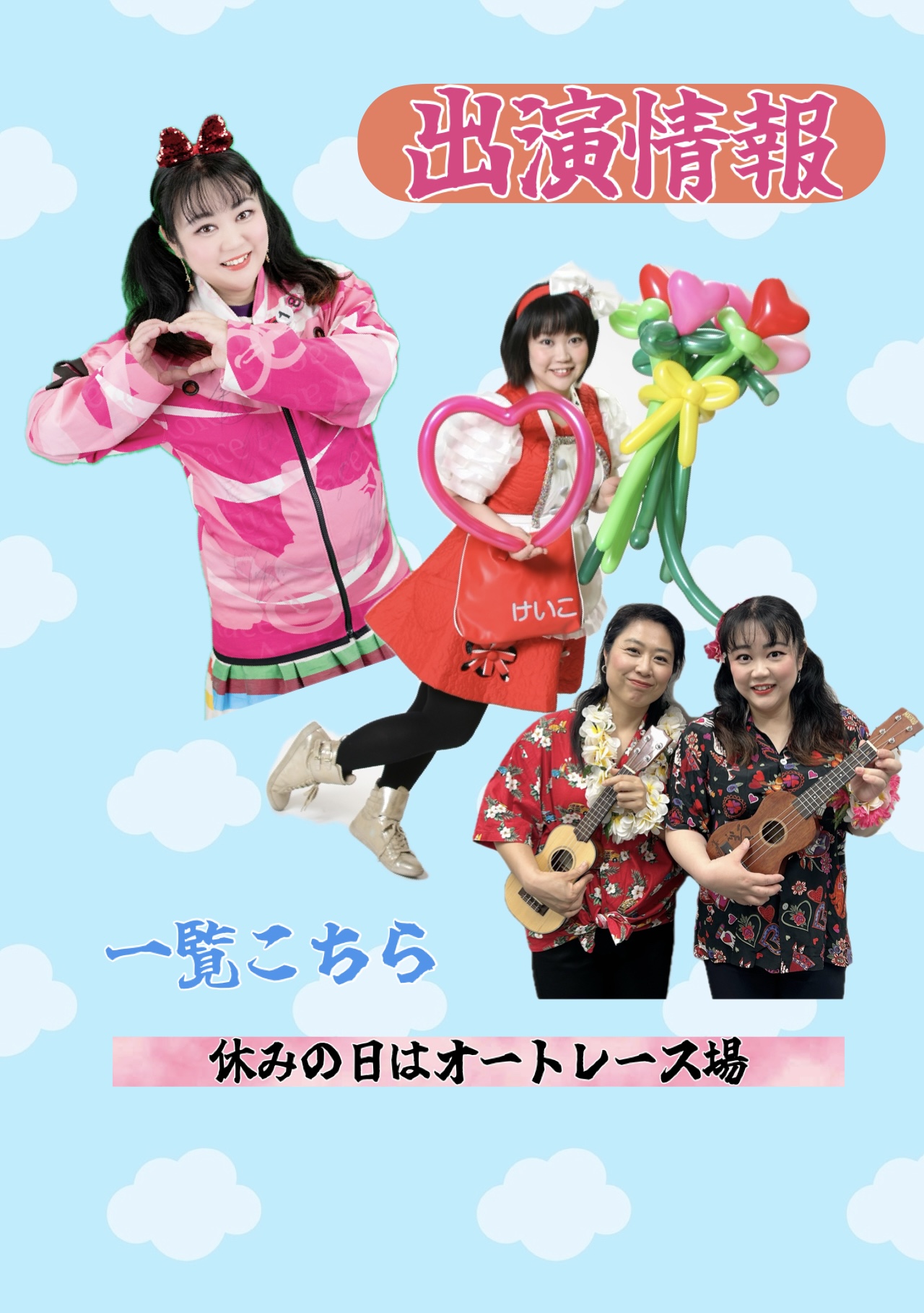 ☆お知らせ☆手術後の安静期間でして4/1〜4/14まで激烈ハードなお仕事はお休みを頂きます。尚、ラジオパーソナリティ、 弊社の会社業務等は通常通り行います。お仕事のご依頼等はご遠慮なくご相談下さい。大変ご迷惑をおかけ致しますが、何卒、宜しくお願い申し上げます。カルーア啓子 オートレースは推しのレースだけでも行きたい🥹☆こちらの投稿スケジュール更新致します☆スケジュールまとめてアップします!お仕事のご相談はお気軽にご連絡ください♪ ※OK←決定優先で、お仕事お受けできます。3/29(土)OK3/30(日)OK3/31(月)NG4月以降ご相談にてお仕事承ります🙇♀️❤️以降の出演スケジュール❤️☆4/23(水)ナカハチオン・タイム音ものお笑い祭4王子 北とぴあつつじホール18:30開演です。東京カルーア出演【東京カルーア】出演!ご来場ご検討宜しくお願い申し上げます🌸チケットのご予約はカルーア啓子まで宜しくお願い申し上げます🙇♀️#柳亭小痴楽#びーランチ#寒空はだか#ポカスカジャン#東京ボーイズ#東京カルーア☆4/30(水) 大宮ヴォイスバーJ☆ジェイ出演:カルーア啓子(バルーンアート)、他是非、遊びにいらしてください♪一部、二部あり♪ご予約承ります。詳しくはこちらhttps://www.voicebarj.com☆5/10(土)豊田こども大会カルーア啓子バルーンショー(事前申し込み制)☆5/25(日)しおさい鹿島カルーア啓子のバルーンショー、他観覧可能♪☆6/1(日)永平寺別院長谷寺(東京都港区西麻布2-21-34)カルーア啓子のバルーンショー開催観覧可能♪要予約申し込み。☆6/1(日)夜クローズイベント☆7/20(日) 世田谷区立保健医療福祉総合プラザ14時〜15時半https://www.setagaya-sougouplaza.jp/☆11/6(木)西葛西演芸会☆浅草東洋館☆#オートレース漫談 カルーア啓子出演時間ボーイズバラエティー協会下席次は5月下席に出演予定です!https://www.asakusatoyokan.com/sp/timetable/new.php?detail_data=1445573780-103812【料金】大人:3,000 円 学生:2,500 円 小人:1,500 円開場12時00分、開演12時30分★お仕事大募集★カルーア啓子ではバルーンアート各種装飾、バルーンギフト、お笑いバルーンショーなどの他にも芸人、各種パフォーマー、鶏🐓、歌手、司会者、著名人などのブッキングなども行なっております。ご希望に合わせてお客様の心に沿った内容でお届けいたします。面白かった!頼んで良かった!と言っていただける内容に自信があります!!急な開催にも対応します!歓送迎会、各種イベントに!!是非、お気軽にご相談ください。カルーア啓子[お笑いバルーンショー/司会/オートレース漫談/歌謡漫才 東京カルーア/コント/かき氷/盛り上げ/流し演芸/他]