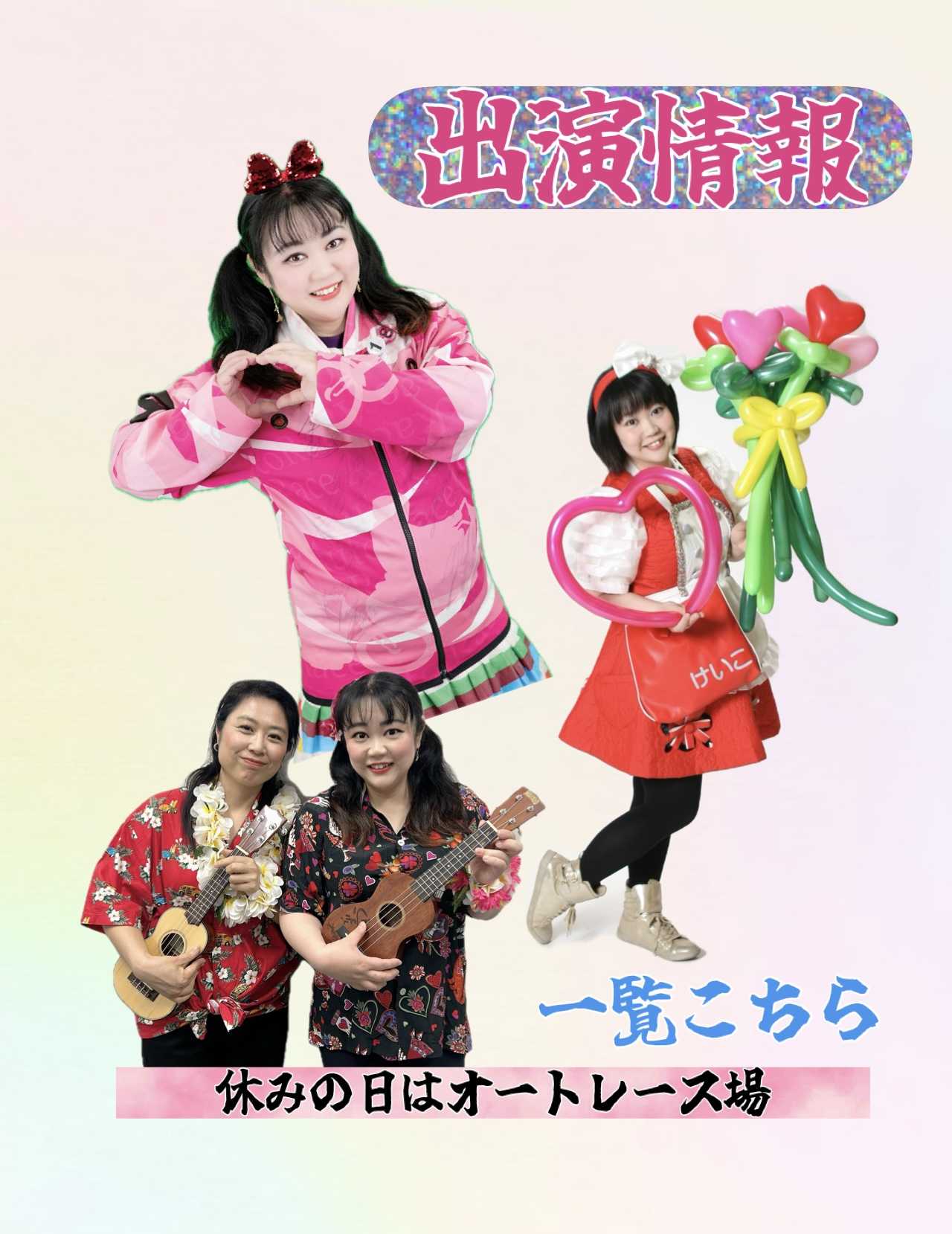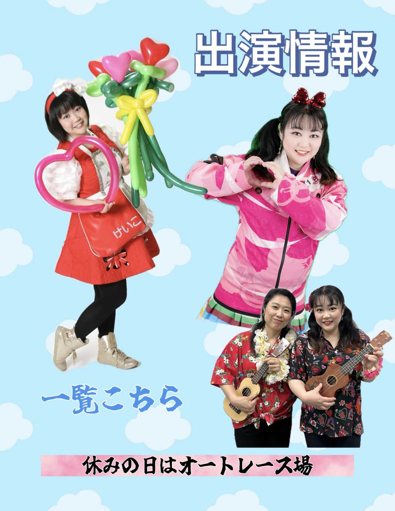 ☆スケジュール更新致します☆OK日は決定優先でお受け出来ます!お気軽にご相談、ご連絡ください♪ 10/30(木)OK10/31(金)OK11/1(土)深見児童クラブ様(午前)予約制FMやまと公開収録15:00〜16:00予定🩵ご観覧頂けます🩵大和シリウス一階オープンスタジオにてゲストは(バンド)TOMONEのvo.三橋翔さんです!11/2(日) ららぽーと富士見https://mitsui-shopping-park.com/lalaport/fujimi/カルーア啓子のバルーンアートプレゼント11:00-18:00(途中休憩あり)実施場所docomo(3F D-1)11/3(月・祝)つぼフェス!(静岡県御殿場市) https://tsuboguchi.co.jp/katsuei/どなた様でもご来場ご観覧頂けます‼️11:10〜11:40お笑いバルーンショーショーが終わったらグリーティング(バルーンアートプレゼント)14:10〜14:40お笑いバルーンショーショーが終わったらグリーティング(バルーンアートプレゼント) 11/4(火)OK川口オート行きたい11/5(水)OK川口オート行きたい11/6(木)西葛西演芸会18:00〜出演(予約制)💙どなた様でもご観覧出来ます!11/7(金)OK11/8(土)社会福祉法人 桔梗苑福祉会地域密着型特別養護老人ホーム寿松園周年祭 出演カルーア啓子のバルーンショー静岡県湖西市岡崎602-1TEL:053-488-5311💙どなた様でもご観覧出来ます!11/9(日)イオンモール春日部(開催場所が変更になっております)🎈カルーア啓子のバルーンアートプレゼント埼玉県春日部市下柳420-12Fフードコート前11:00-18:00(途中休憩あり)💙どなた様でもご参加頂けます!!11/10(月)OK11/11(火)OK11/12(水)OK11/13(木)OK11/14(金)OK11/15(土)JA横浜大正支店農業まつり🩷どなた様でもご参加&ご観覧出来ます!カルーア啓子のお笑いバルーンショー1回目10:00〜/2回目11:30〜【夜】飯塚オートレースミッドナイトオートレース配信出演予定11/16(日)SAMUKAWAお笑い祭り2025 🩷どなた様でもご参加&ご観覧出来ます!☆観覧無料☆先着500名〜出演〜冷蔵庫マン(お笑い)ふじきイェイ!イェイ! (ものまねショー)脳みそ夫 (お笑い)三遊亭あら馬 (落語)カルーア啓子(お笑いバルーンショー)開場 13:00/開会 13:20お笑いライブ13:30~14:50休憩 14:50~15:00抽選会 15:00~15:3011/17(月)ラジオ公開収録15:00〜16:00ゲスト 柳家あお馬さん11/18(火)OK11/19(水)OK11/20(木)OK11/21(金)浅草東洋館出演※オートレース漫談カルーア啓子13:00〜11/22(土)イオンモール大和(神奈川県大和市下鶴間1-2-1)永野&カルーア啓子お笑いライブ🩷どなた様でもご観覧出来ます!1日2回ステージ(※観覧には整理券が必要です)https://yamato-aeonmall.com/11/23(日)春日部湯元温泉アテンド【出演】虹の黄昏 1回目:14:00~14:152回目:15:00~15:153回目:16:00~16:15かすかべ湯元温泉場所:館内1階エレベーターホール前🩵ご入館のお客様は観覧無料。11/24(月)OK11/25(火) 浅草東洋館出演※オートレース漫談カルーア啓子13:00〜11/26(水) 浅草東洋館出演※オートレース漫談カルーア啓子13:00〜11/27(木)応相談11/28(金)応相談11/29(土)飯塚オート11/30(日)飯塚オート12/1(月)応相談12/2(火)応相談12/3(水)応相談12/4(木)応相談12/5(金)応相談12/6(土)応相談12/7(日)親子ふれあいコンサート定員400名 事前申込観覧可能以降お問い合わせください。☆12/17 (水)飯塚ミッドナイト配信出演☆12/27 (水)飯塚ミッドナイト配信出演☆ 12/30 (水)かすかべ湯元温泉カルーア啓子のお笑いバルーンショー🩷どなた様でもご参加&ご観覧出来ます!ご入館のお客様は観覧無料。☆浅草東洋館☆#オートレース漫談 カルーア啓子出演時間ボーイズバラエティー協会下席出演予定11/21(金)13:00〜、11/25(火)13:00〜11/26(水)13:00〜https://www.asakusatoyokan.com/sp/timetable/new.php?detail_data=1445573780-103812【料金】大人:3,000 円 学生:2,500 円 小人:1,500 円開場12時00分、開演12時30分【番組告知】#飯塚オートレース場公式YouTubeチャンネル「真夜中の飯塚決戦~冬の陣~ザ・ドリームマッチ」出演中。FMやまと(FM77.7Mhz)カルーア啓子の『お笑い!ヤマトナデシコ』毎週月曜日19:30~20:00(再放送は毎週日曜日の16:00〜16:30)インターネットでも『カルーア啓子のお笑い!ヤマトナデシコ』が聞けます!FMやまとのホームページよりアクセスしてください。http://fmyamato.co.jpこちらからダイレクトアクセス🔻https://www.jcbasimul.com/radio/730★お仕事大募集★バルーンアート各種装飾、バルーンギフト、お笑いバルーンショーなどの他にも芸人、各種パフォーマー、鶏🐓、歌手、司会者、著名人などのブッキングなども行なっております。ご希望に合わせてお客様の心に沿った内容でお届けいたします。面白かった!頼んで良かった!と言っていただける内容に自信があります!!急な開催にも対応します!歓送迎会、各種イベントに!!是非、お気軽にご相談ください。カルーア啓子[お笑いバルーンショー/司会/オートレース漫談/歌謡漫才 東京カルーア/コント/かき氷/盛り上げ/流し演芸/他