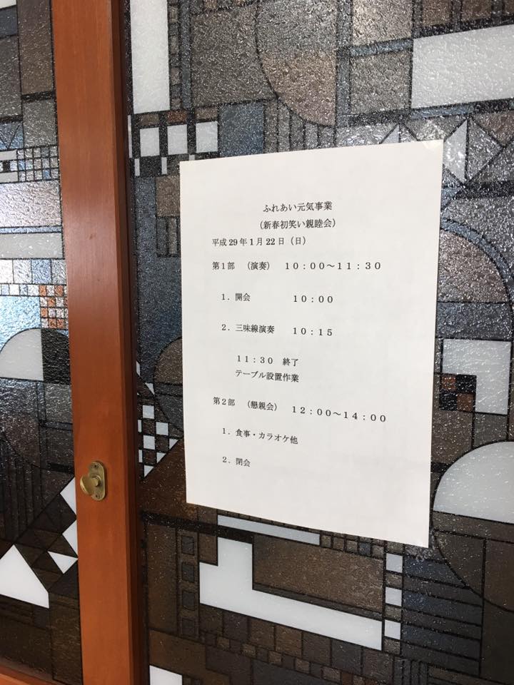 今日は脇のふれあい館2階で新年会。 まずは地元出身の方の三味線に合わせて発生練習、日本古来からの民謡と童謡、武田節も久しぶりに歌う、、 中学での修学旅行だったか、国語担当だった阿部先生が余興で歌ったのが、初めてでそれ以来、この節は気に入っている、、、 以下、花笠音頭、故郷、黒田節、鹿児島おはら節、真室川音頭、里の秋、赤とんぼ、茶つみを合唱、歌詞を吟味しながら、、、 そのあとは懇親会、計30数名が参加、