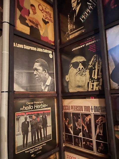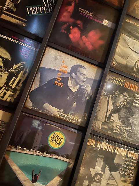 ジャズのレコードジャケットが店内の各所にはめ込まれている。そこにはレコードも入っているという。どれもが年代ものでそれぞれに思いが詰まっている。