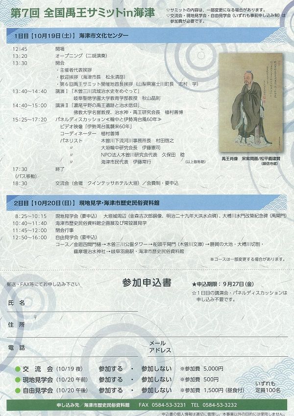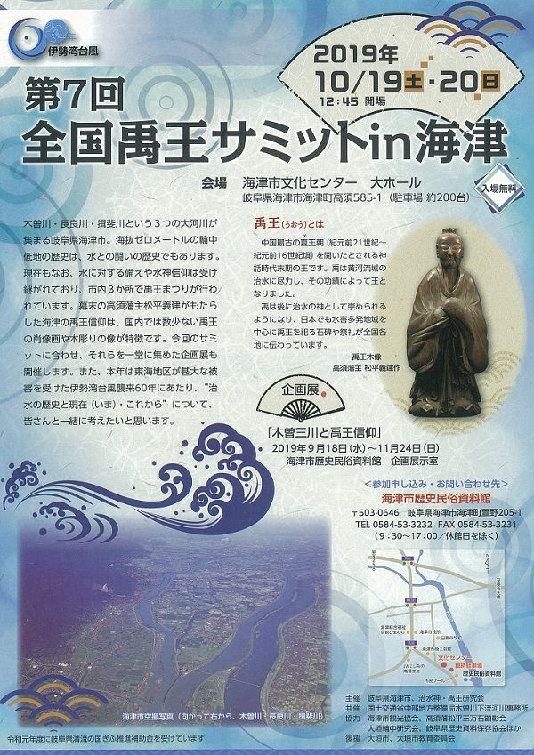 海津市でも市内3か所で禹王まつりが行われるなど、 ​水神信仰は受け継がれており​ 、今年の10月19日(土)と20日(日)の2日間、海津市文化センターなどで ​​ 「第7回全国禹王サミットin海津」が開催されます