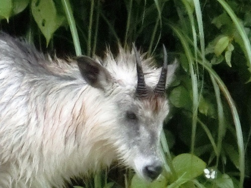 7月17日(木)今日は午後から雨になりました。午後からブログを更新してすぐ、雨脚が強くなったので田んぼの見回りに出ました。沢ざわの田んぼを見回って、午前中草刈りをした沢に行った所多分、午前中に見たあのカモシカが・・・。 雨をしのぐように・・・。 こんなところで、こんな格好でジッとしていました。私が、車を降りて雨の中を午前中とまた同じように静かに近づいて行くと 気づいたようで振り返りました。 身体はもうずぶ濡れのようでしたが、それでも此処を動こうとはしません。雨は止まずに降り続き、私も頭に被ったタオルも濡れて来ました。この画像を見るとにらんでいて怖いように思えますが一番最初の大きい画像を見ると、とてもそんな感じには見えないですよね。雨の時は、何時もこうして雨宿りしてジッと止むのを待ったいるんでしょうか?私は、何も出来ずその場を立ち去りました。なんか、後ろ髪を引かれる思いとでも言いましょうか・・・。恋人を置き去りにしたような、切ない寂しさのような感じを覚えました。でも、これが自然界の定め。住む世界が違うし、こうして雨の日も雪の日も生きて行かなければいけないんですよね。人間の私が手を貸す事は出来ないし、受け入れる事もしないでしょう。ちょっと感傷的になって家に帰りました。田んぼの見回りなんかに行かなきゃ良かった。そうすれば見なくて済んだのに。そんな事を思った午後でした。このブログは、楽プロへは反映しません。もしご覧になってコメントを頂いてもお返事は出来ないと思いますので、そのままスルーしても一向に構いません。私のひとり言ですから・・・。