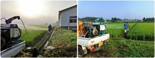 7月29日(火)こんにちは。今週も2日目になりました。今朝のお目覚めは如何でしたか梅雨明けも進み。此方秋田でも昨日やっと明けたようです。今宵も案山子の宿にお立ち寄り頂き有難うございます。さて、早起きの私は今朝も4時半起きです。と言うのも、稲の共同防除を5時からする為、何時もよりちょっと早起きして作業をしました。稲の防除は、収穫までに3回実施します。今回はその1回目になります。 何時も共同作業をしているOさん親子と3人で作業をしました。今回の防除は、稲の紋枯れ病、いもち病、の防除になります。無人ヘリや有人ヘリでの防除をしている所もありますが私の所は、こうして軽トラにタンクと機械を積んで3人で行っております。 この機械は、ひとりでも散布可能なのですが、田んぼの距離が長いとホースが結構重いので難儀なんですね。だから、オペが一人に、ホースを持つ人が2人いるととても楽です。5時から始めて、1.8haの田んぼを7時前に終わりました。Oさんは建設関係の会社に勤めているので、今日はこの時間に終わりです。明日の朝に、また別の場所を散布する予定です。涼しいうちは仕事もしやすいですねところで、まえのブログで「たつこもち」の幼穂が出来ているという話をしましたが、昨日午後から田んぼに行ってみたら穂が出ているのを発見しました。 それで、急いで田んぼに入水。 溝切りしたところを水が流れて行きます。田んぼ全体に水が回ったら止めて追肥します。出穂時や稲の花が咲く頃は水を必要とします。これからの水管理は、間断冠水で、穂が出揃ったら完全落水し田んぼを干して硬くし、秋の収穫に備える事になります。稲も無農薬栽培が一番いいんでしょうが、雑草処理やいもち病などの病気それを管理して行くには、大変な労力が必要になると思います。私の所は、JAさんが認可している農薬を基準値内で必要最小限で使用しております。秋の出荷時には、栽培履歴や農作業記録簿などの提出が必須条件になっており出さない農家はJAさんでは引受けされませんね。まあ、JAさんを通さず個人売買されている方もおりますけどね。コメの値段も安いですし、業者さんと直接取引されている農家も結構いるようです。これからのお米は、そう言う選択肢もありかなって思ってますが…。政府の今後の出方が気になるところですが、まあ、なるようにしかならないだろうな(笑)そうそう、今日は知人からスイカを頂きました(^^) 規格外で出荷できない物との事でしたが、味は変わらないですよね。そのお宅で、一口頂いて食べましたが凄―く甘くて美味しかったです^^一番大きいのを仏様にお供えしました。もうすぐ8月。お盆も駆け足でやってきますね。まだまだ暑い日が続くと思いますが、夏バテ、熱中症には充分気を付けてこの夏を乗り切って行きましょう。ではでは、次回も案山子の宿でお逢いしましょう最後までお付合い有難うございました<(_ _*)> ☆お詫び☆ このところ、コメントが連打したり、誤字脱字が多くなってご迷惑を お掛けしております。連打した場合は出来れば削除を、誤字脱字は それなりに解釈して頂ければと思います。宜しくお願いします<(_ _)>