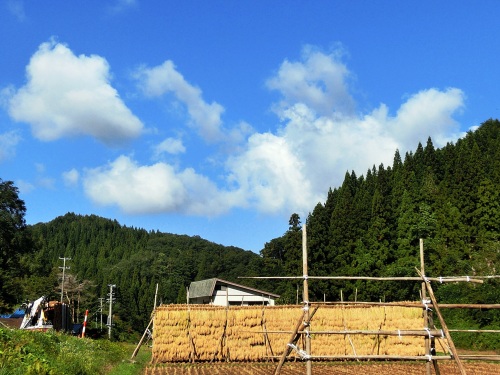 9月30日(火)9月も残す所今日1日だけとなりましたね。週初めの昨日は良いスタートを切れましたでしょうか?御嶽山が先日、噴火して犠牲者が出てしまいました。活火山は何時噴火するか分かりませんね。予知とかできるとこんなに犠牲者が出なかったと思いますが自然の力は偉大ですね。遺族皆様の心中をお察しすると共に、亡くなられた方のご冥福をお祈りいたします。さて、今朝も冷え込みが激しく、気温も一桁台になりました。昨日は、秋晴れの良い天気となり、農作業も捗りました。稲架掛けもいよいよ大詰めです。そんな昨日の午後からですが、3時頃に休憩している所へ国道に車を止めて農道を歩いてオイラ達の方へ歩いてくる男の人がいました。\( ̄□ ̄)/ハハァー!!m( ̄_ ̄)m(「・・」ン?もしかすると・・・予想的中(笑)「すみません、写真撮らせて貰えませんか」ここ3~4年位毎回、誰かが稲架掛けの様子を写真に収めて行きます。例外なくこの方もそうでした^^「モデルが悪いから、カメラが壊れても知らんぞ」と笑ってOKしましたがなんと、家族で休憩している様子まで撮っていきました^^予め、分かっていればもう少し美味しそうなお菓子でも準備したのに(笑)せんべいと魚肉ソーセージだけじゃね・・・^^休憩を終えて作業を始めると、その様子も一生懸命撮っていたようです。このくそ忙しい時に、気になって作業に身が入いらん(爆)もう勘弁してくれ~~ 結局、30分位いたでしょうかお茶までご馳走して、お話まで付き合って・・・(ノ_-;)ハア…今度からは、案山子コーポレーションの事務所の方に連絡を入れてから来て下さい(笑)アポなしは困ります(爆) ※クリックしてもリンクはないよ!当りまえだげど( ̄m ̄〃)ぷぷっ!と言う事で、快く帰りましたが、それだけ稲架掛けの風景と言うか家族総出での農作業自体が珍しくなっているんでしょうね。この写真は、昨年脱穀作業の時に写真を撮って行った方から送られてきた中の1枚です 機械で脱穀しているのがおっ母で、籾の入った袋を担いでいるのがオイラです^^そして親父。オイラ、腰がふらついているように見えますが…だ、大丈夫かな(^^);稲架掛けの稲は、田んぼで脱穀して小屋に運び乾燥機で仕上げ乾燥します。脱穀するまでは2週間位天日干しするので、今回稲架掛けした稲はオイラの誕生日頃の脱穀になるだろうな。オイラモ忙しい時に生まれたもんだ(笑)その稲架掛けも、今日で終わる予定です。今年の稲刈りはお天気に恵まれ順調に作業をする事が出来ました。この後のお天気も心配ですが、まずは一区切りつく見通しが立ったのでホッとしております。長丁場のコメ作りもいよいよラストスパートフィナーレが近づいて来ました。来月末には新米が食べれるようになるかと思っています。それでは、今日はこの辺で失礼させて頂きます。最後までお付合い有難うございました <(_ _*)> 次回も案山子の宿でお逢いしましょう今週も宜しくお願い致します。良い1日を(^_-)-☆