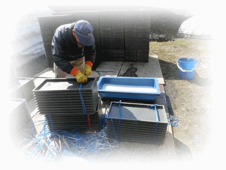 息子とふたりで朝から始めた床土の肥料合わせ作業。