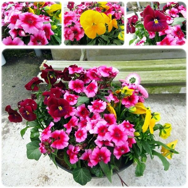 カミさんが昨日、病院へ行った帰りに買って来た寄せ植えの花。