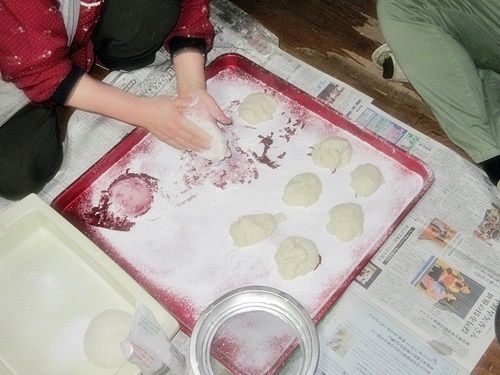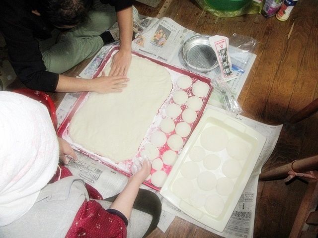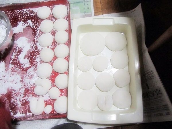 片栗粉を敷いた所へ、息子がお餅を適当な大きさでちぎりカミさんが丸めます。