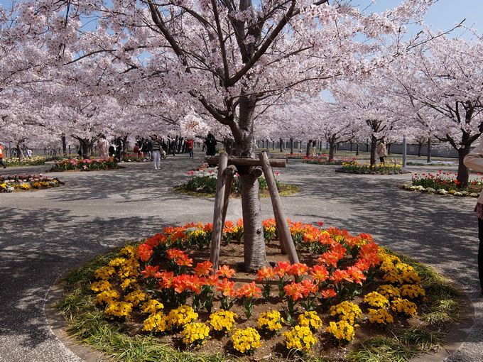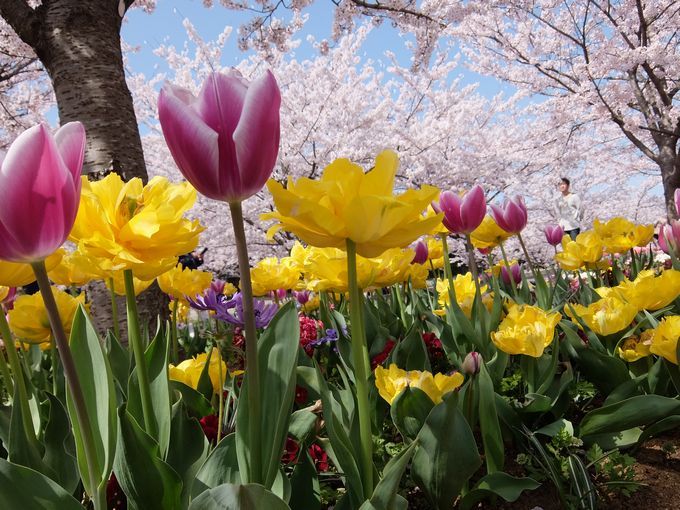 某公園の桜とチューリップのコラボ、春爛漫と言った感じですね。