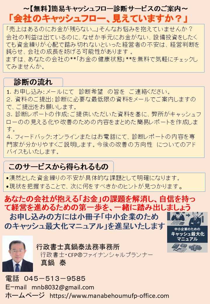 【無料】キャッシュフロー診断のチラシを新しくしました。行政書士真鍋泰法務事務所