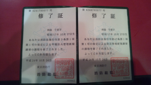 日々移動が多い柿島の仕事 いろいろな場面に出合います 中には事故にも、もちろん遭遇します 先日東京駅で、エスカレーターから ご婦人2名が転落して(だいぶ派手に) 柿島ともう1名の男性が、救護に動きまして 幸い大事なく、駅員さんに引き継いだのですが… そのときに周りにいた多くの方は 何もすることができず、傍観者となっていました 残念な気持ちでその場を後にしたのですが 何もしなかったのではなく 何をしていいかわからなかった のではないでしょうか? 手を出すのは怖いと思いますよね… でも、正し知識があれば何も怖いことはありません いざというときのための対応 救命救急法など調べてみようという方は コチラをご参考にどうぞ → 日本赤十字社 お近くの消防署などで、頻繁に講習会も行われています 自分や、自分の周りに何か起きた時どうするか? 日ごろから考えておきませんか? ちなみにこれは、かきしま母のもの 70歳に誕生日を目の前にして 防災管理の講習を修了していました (これには、かきしまも驚きましたが) 皆様、今からでも遅くはありません というメッセージを書かせていただきました ☆*☆*☆*☆*☆*☆*☆*☆*☆*☆*☆*☆*☆*☆ リンクからいらした皆様 ブログのTOPページから ブックマークしていただけると嬉しいです ☆*☆*☆*☆*☆*☆*☆*☆*☆*☆*☆*☆*☆*☆